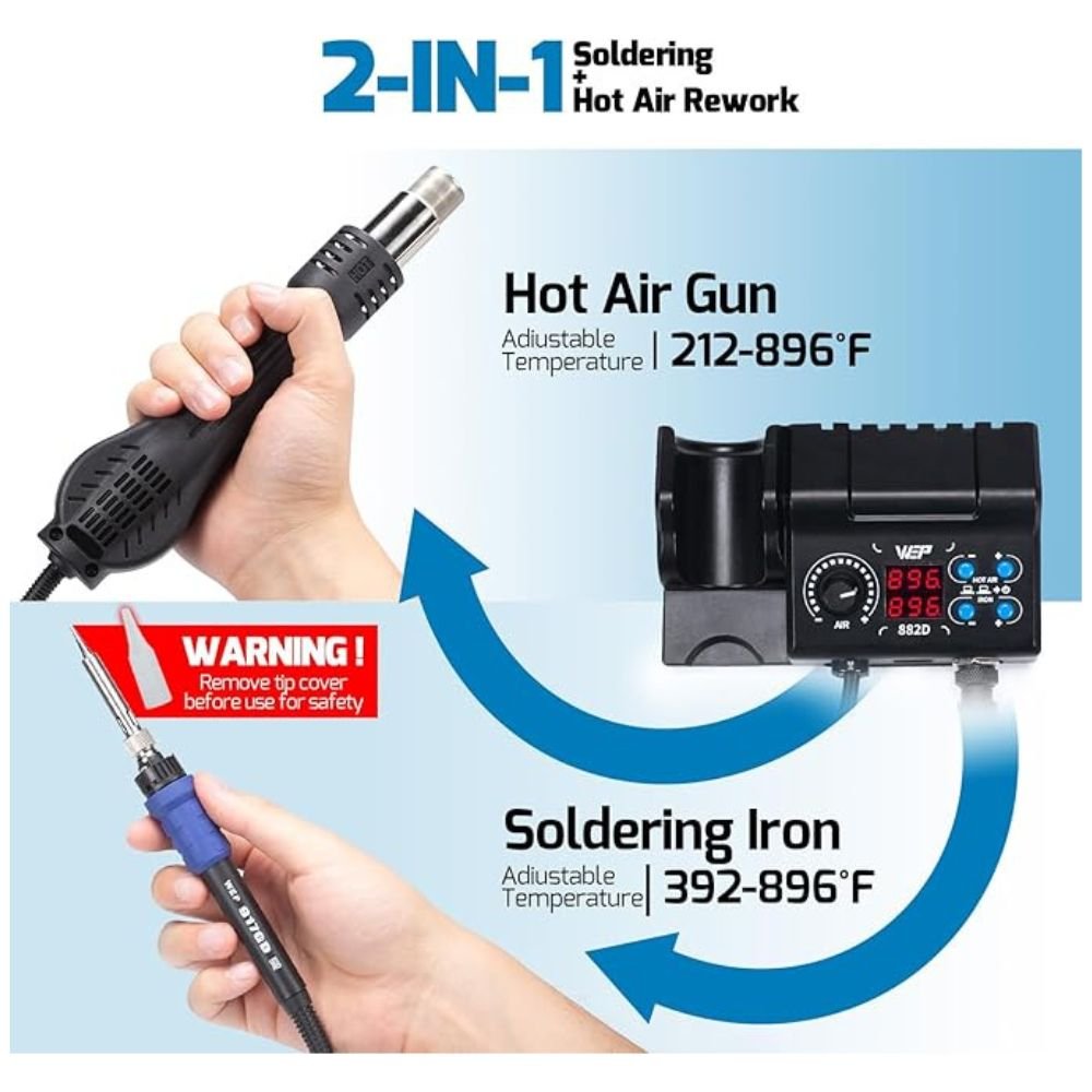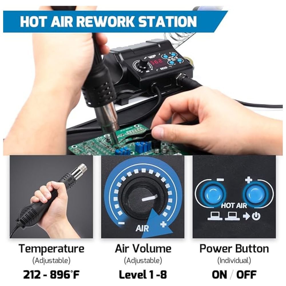 With its built-in PID program, the Soldering Iron Station 2-IN-1 offers precise temperature control for both the soldering iron and hot air gun. The adjustable soldering iron temperature ranges from 392-896°F, while the hot air rework station provides temperatures from 212-896°F, ensuring you can tackle a wide variety of tasks. The ability to adjust air volume further enhances flexibility, providing optimal control for each job.