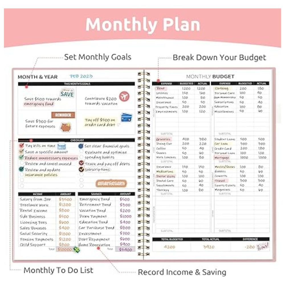 This planner features intuitive monthly layouts, including dedicated pages for financial goals, income tracking, and expense planning. Stay organized and achieve your goals effortlessly.